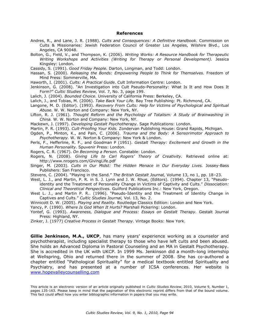 Jenkinson, G. (2008). ―An Investigation into Cult Pseudo-Personality: What Is It and How Does It